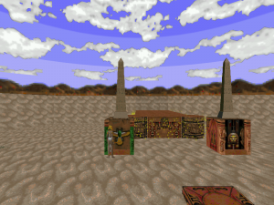 Since this mod was created before DECORATE became a full-fledged content scripting language, the new enemies, items and weapons are created through DeHackEd. The weapons in particular can be recognized as using the logic of Heretic or Hexen weapons. All sprites were created through captures of 3D models created by the author. There are several scripted sequences, which convey exposition for the mod's story or show the changes triggered after lighting a sphinx lantern or placing a colored scarab in an indentation.