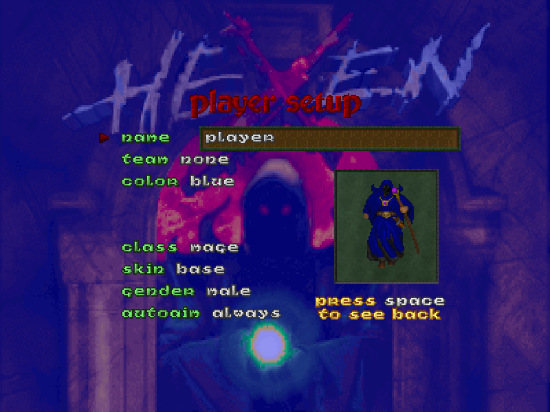 A screenshot of the Player setup menu in Hexen.