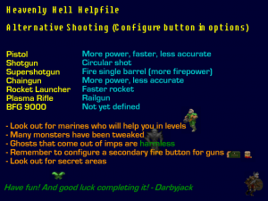 - Now, Heavenly Hell would typically be your 'normal project' with the exception of this; it not only adds new goodies to the levels, like new monsters or weapons {although not a huge amount, this isn't the WRW/MRW :)}, but it improves the originals slightly or gives them new surprises. Most projectiles will more than likely have a trail effect to look a bit more neat. Monsters will have a new attack or two or some other feature of them is changed. Example; DoomImps can have ghosts come out of their bodies when they die.